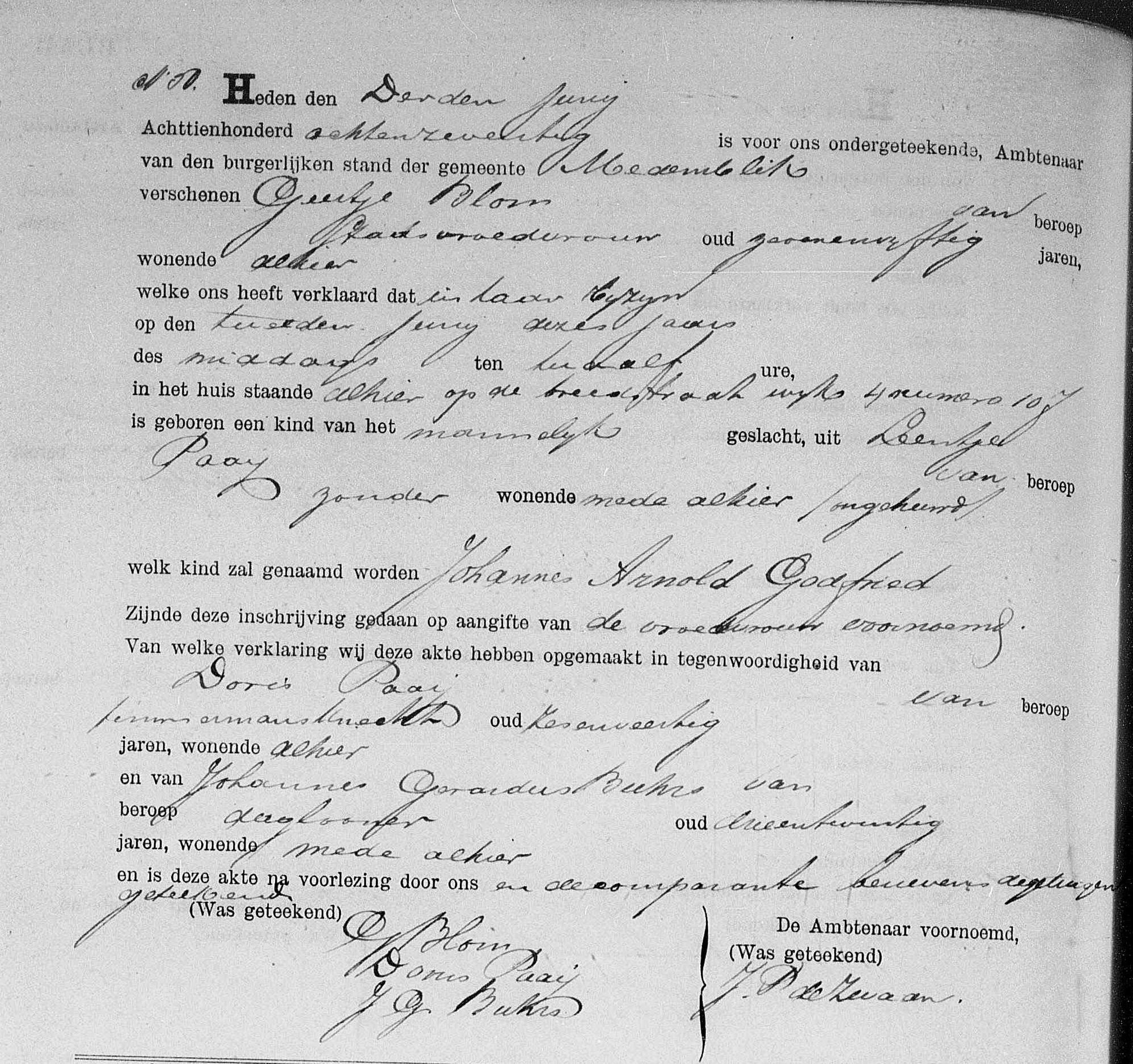 | Trouwt [Akte] met erkenning van Johannes Arnold Godfried Paaij geboren 2 juni 1878 als hun wettig kind op 20-10-1878 te Medemblik, NH, Nederland met: |