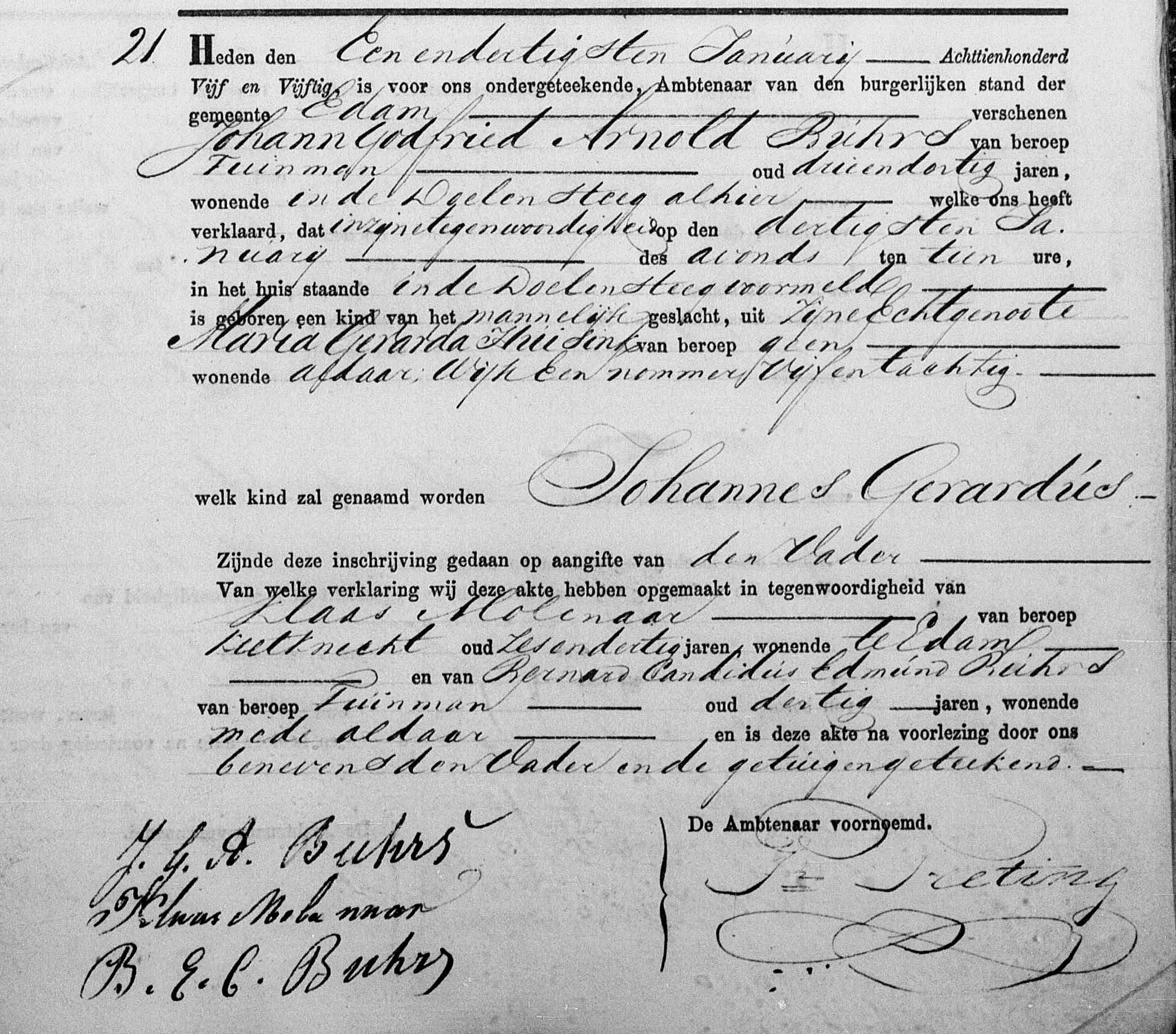 | 18 | 9 | Gerardus Johannes Huisink geboren te Winterswijk, GLD, Nederland, gedoopt r.k. met als doopgetuigen Gerrit Jan Blomers en Catharina Telaar op 20-01-1797 te Winterswijk, GLD, Nederland, van beroep hovenier, overleden om 19:00 uur in het huis staande in de Kleinekerkstraat nummer 27 op 07-04-1865 te Edam, NH, Nederland. |