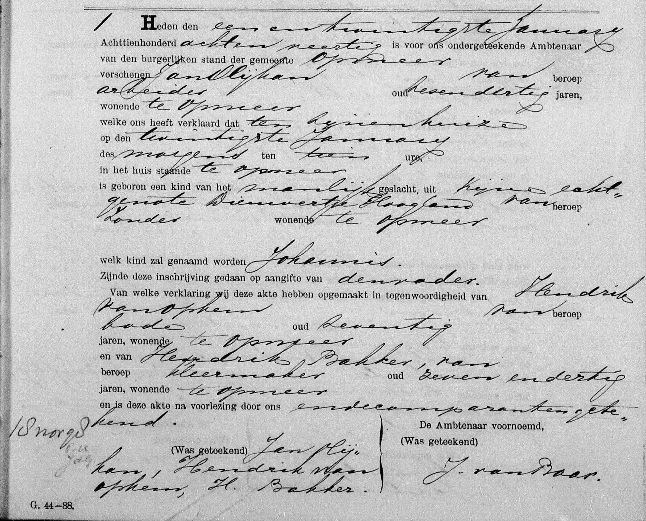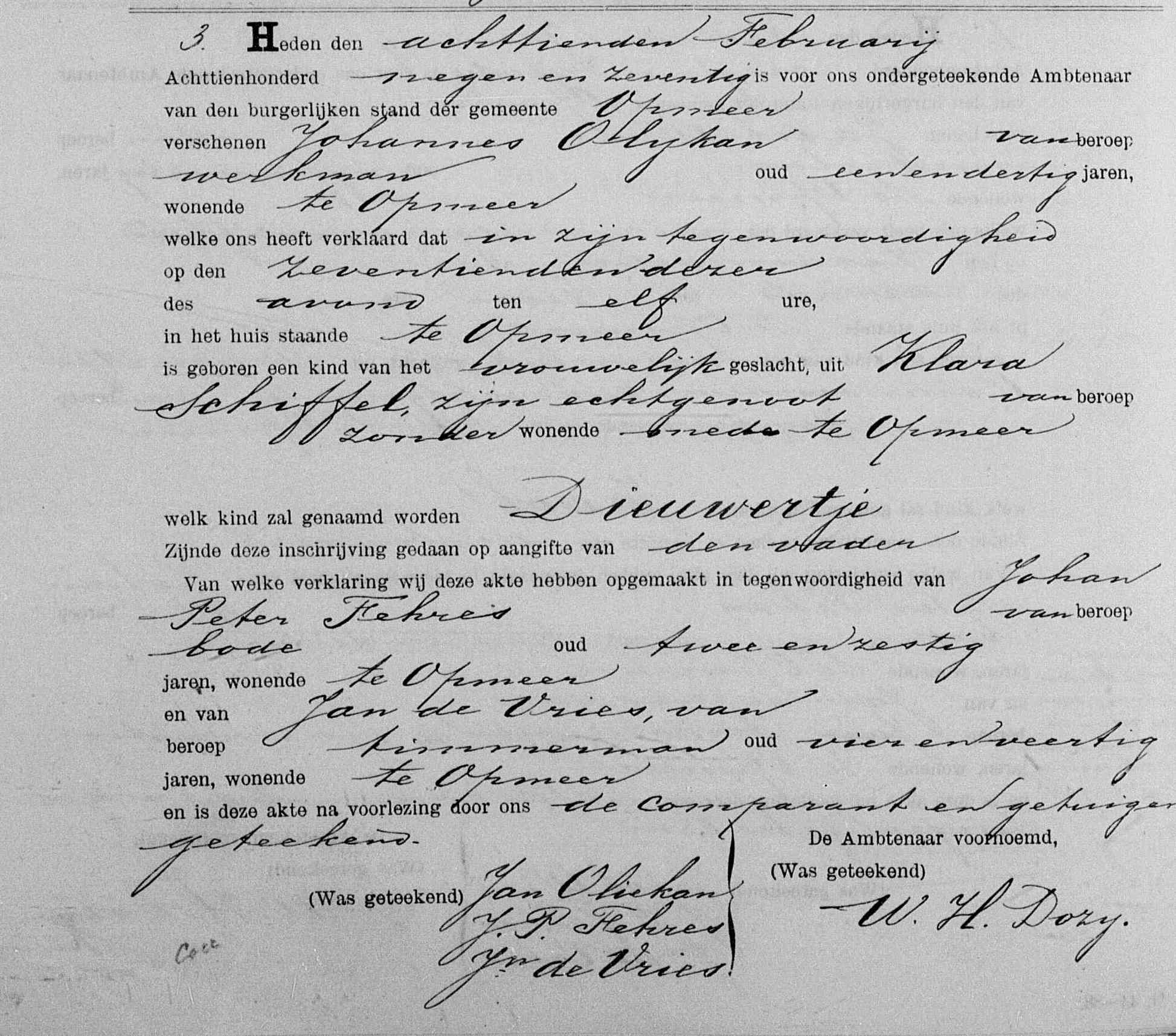 | 6 | 3 | Johannis Olijkan geboren [Akte] om 10:00 uur in het huis staande te Opmeer op 20-01-1848 te Opmeer, NH, Nederland, van beroep metselaar, voeger, overleden om 06:00 uur in de Wijdesteeg nommer 16 op 13-06-1893 te Hoorn, NH, Nederland. |