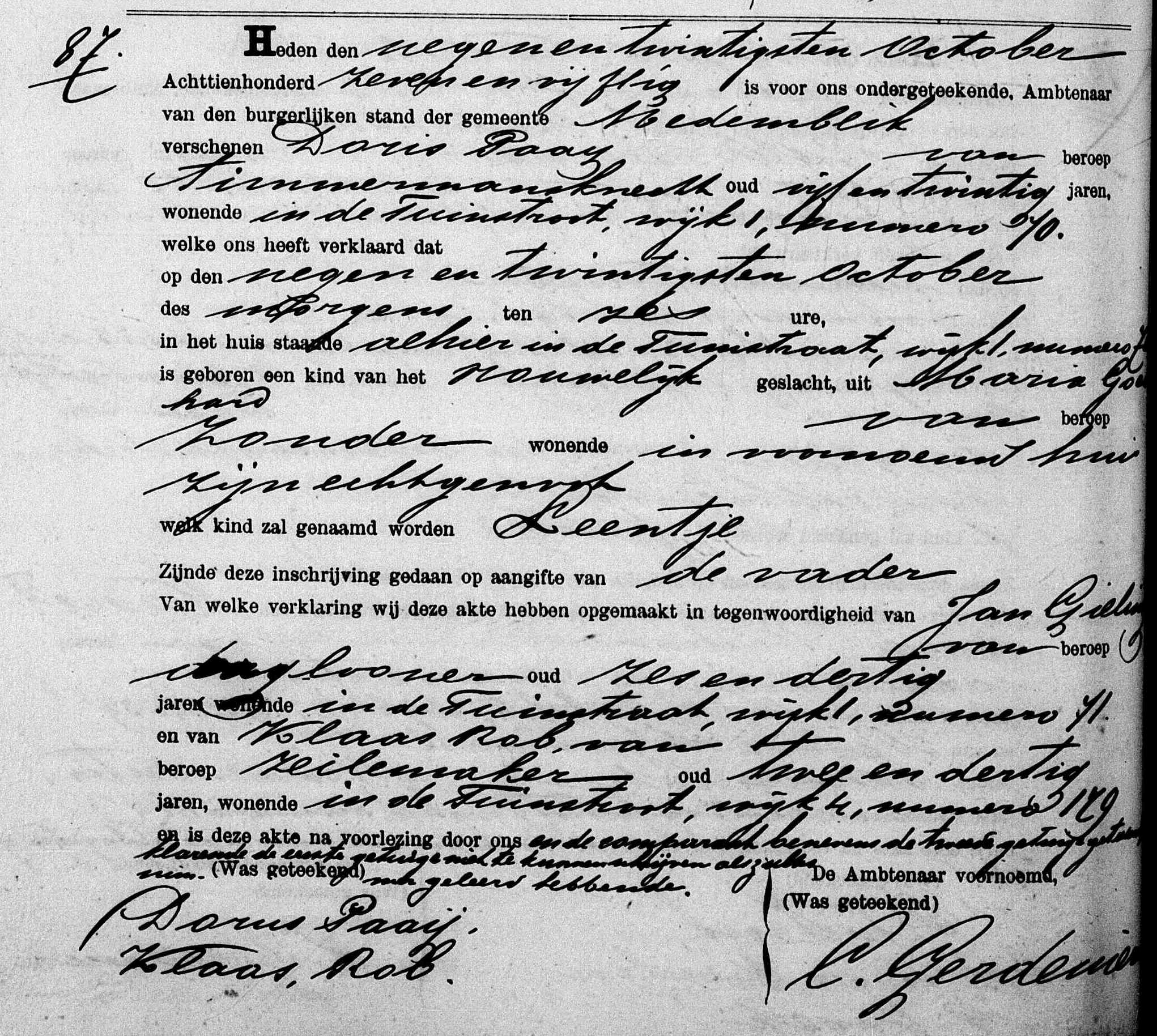 geboren [Akte] om 06:00 uur in het huis staande in de Tuinstraat numero 70 op 29-10-1857 te Medemblik, NH, Nederland, overleden om 19:00 uur op 13-04-1951 te Zaandam, NH, Nederland. |