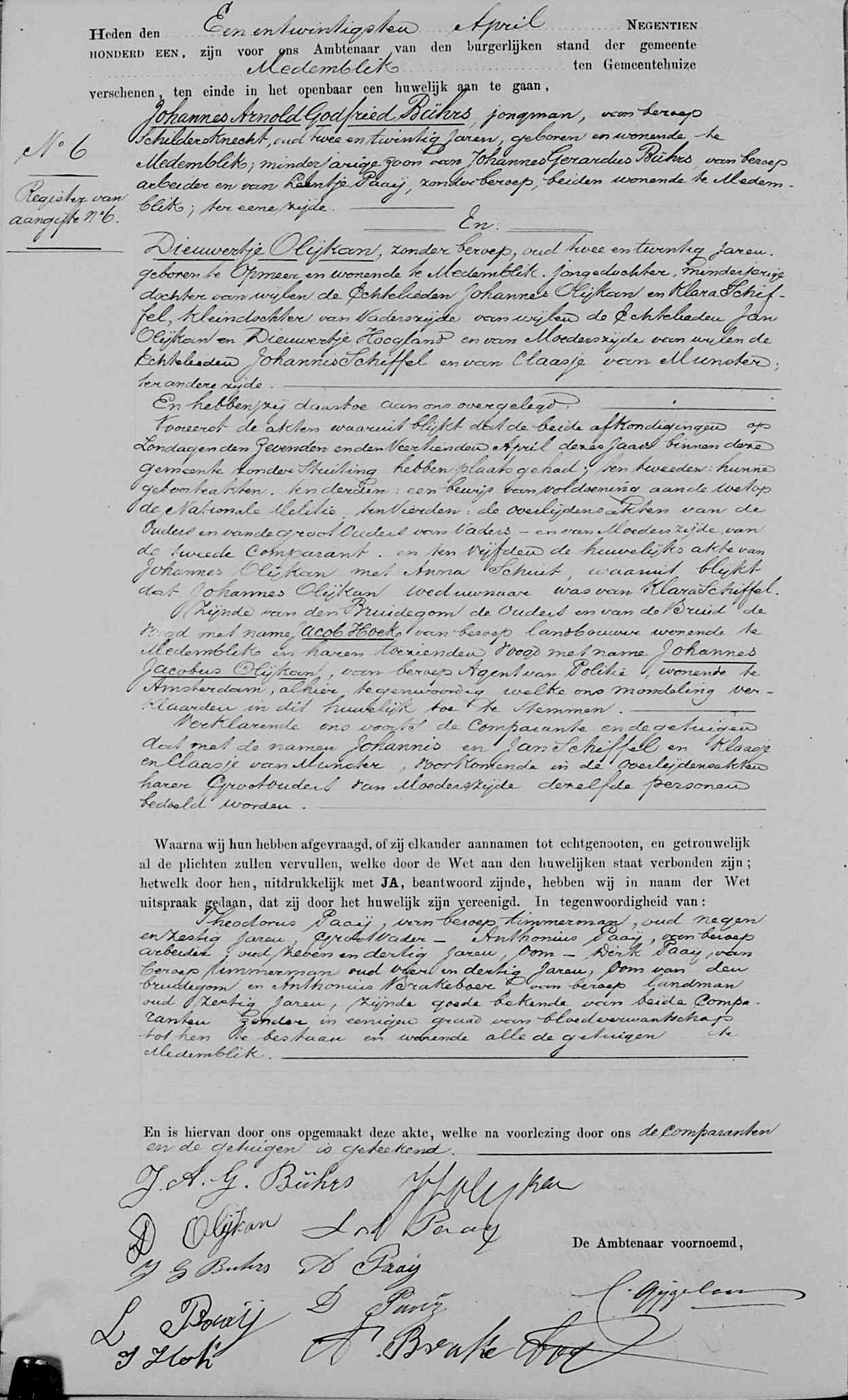 | Trouwt [Akte] met als getuigen Theodorus Paaij van beroep timmerman oud 69 jaren grootvader, Anthonius Paaij van beroep arbeider oud 37 jaar oom, Dirk Paaij timmerman oud 34 jaar oom van den bruidgom en Anthonius Brakeboer landman oud 60 jaar goede bekende van bruidegom en bruid op 21-04-1901 te Medemblik, NH, Nederland [Foto1]