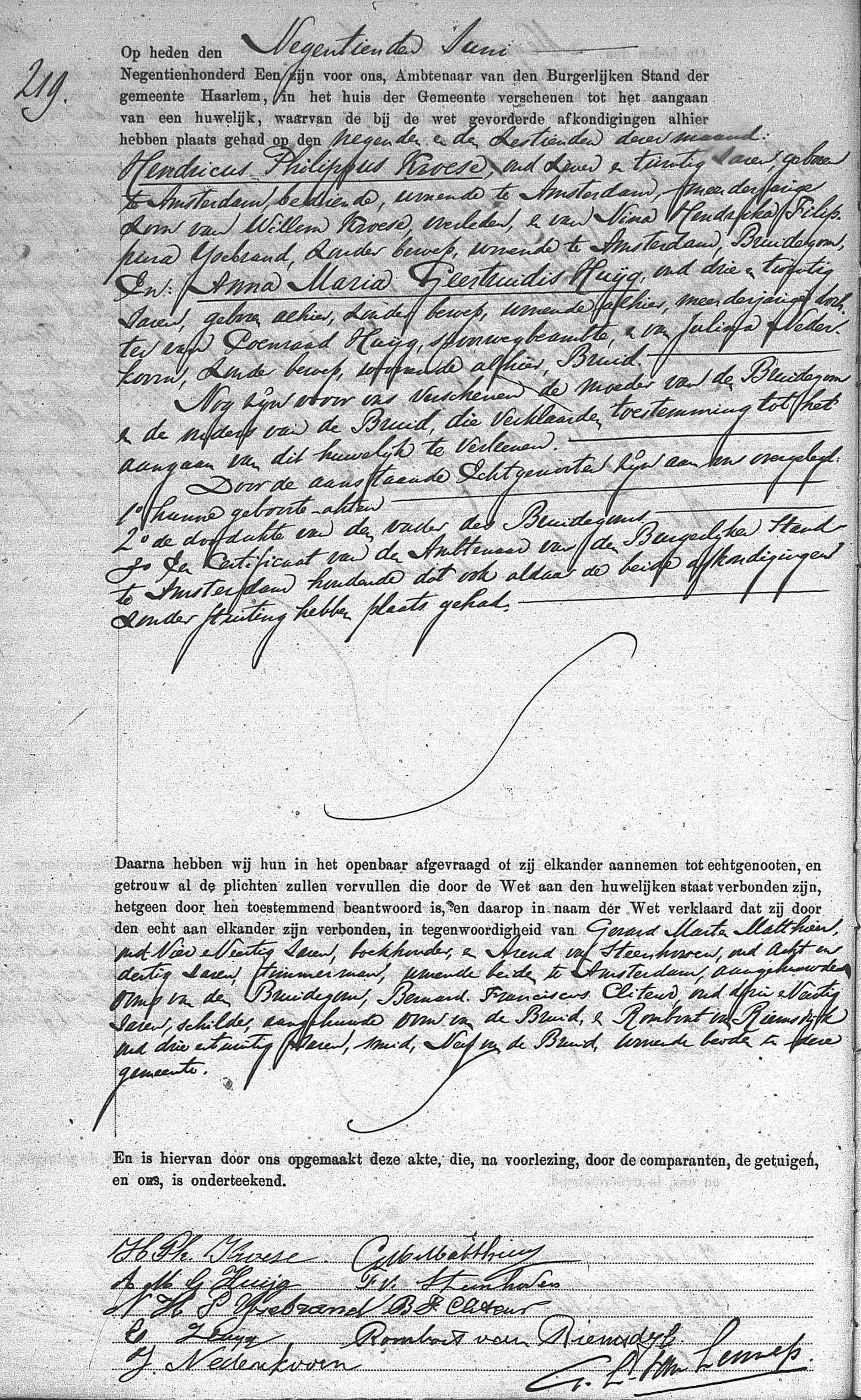 | Trouwt [Akte] met als getuigen Gerard Marten Matthieu en Arend van Steenhoven aangehuwde Ooms van de Bruidegom, Bernard Franciscus Cliteur aangehuwde Oom van de Bruid en Rombout van Riemsdijk Neef van de Bruid op 19-06-1901 te Haarlem, NH, Nederland [Foto1]