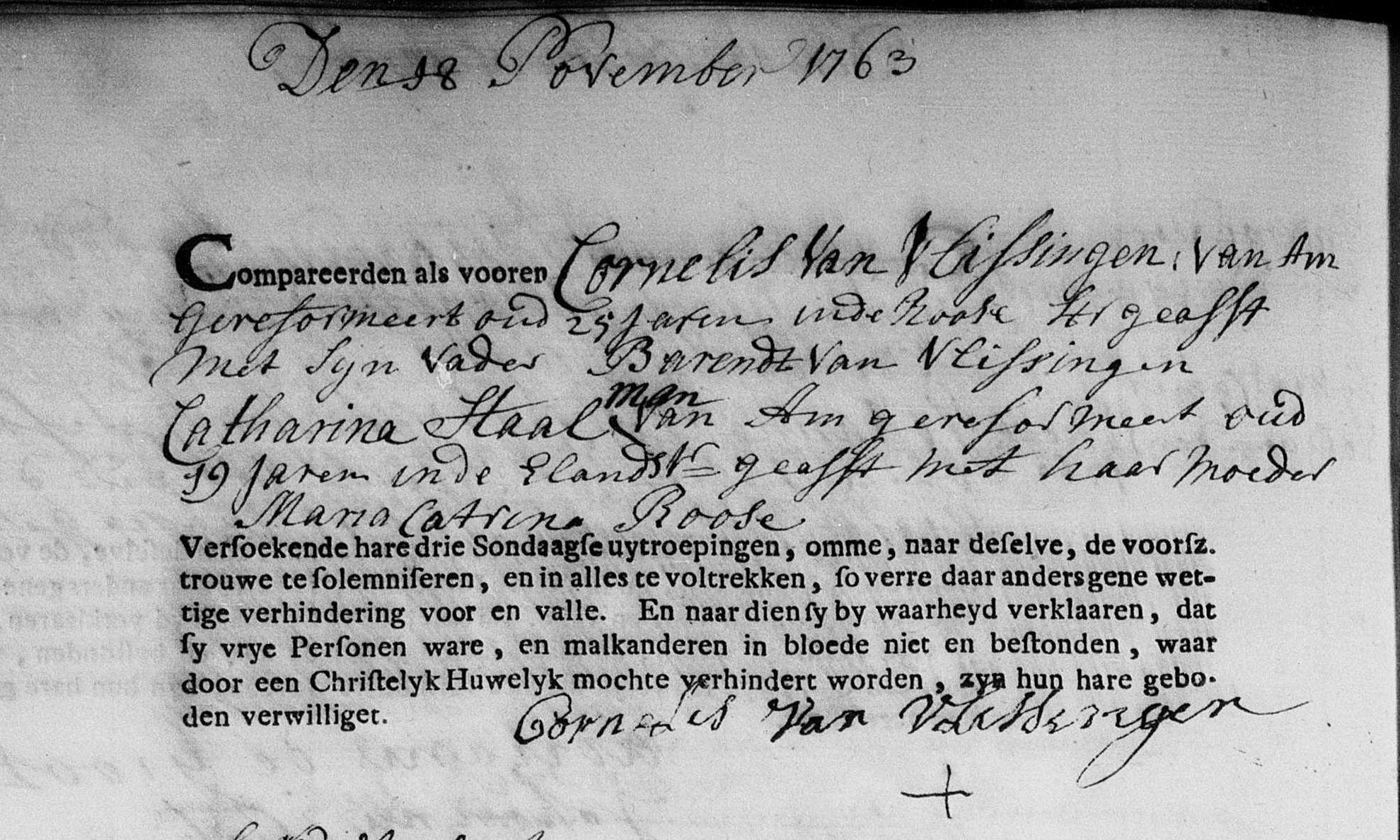 | Trouwt kerkelijk [Akte] (ondertrouw) met als getuige van de bruidegom zijn vader Barendt van Vlissingen en van de bruid haar moeder Maria Catrina Roose op 18-11-1763 te Amsterdam, NH, Nederland [Foto1]
