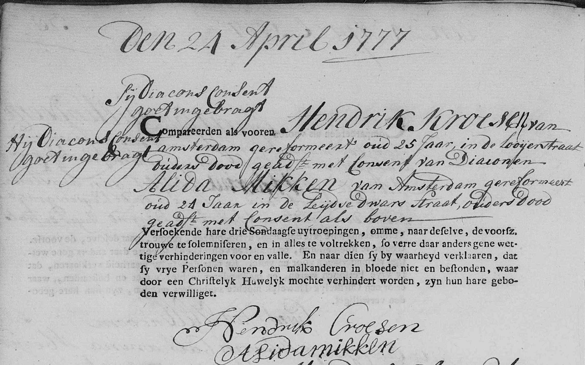 | Trouwt kerkelijk [Akte] (ondertrouw) met als getuige voor beiden het Consent van Diaconen aangezien beiden wees zijn op 24-04-1777 te Amsterdam, NH, Nederland met: |