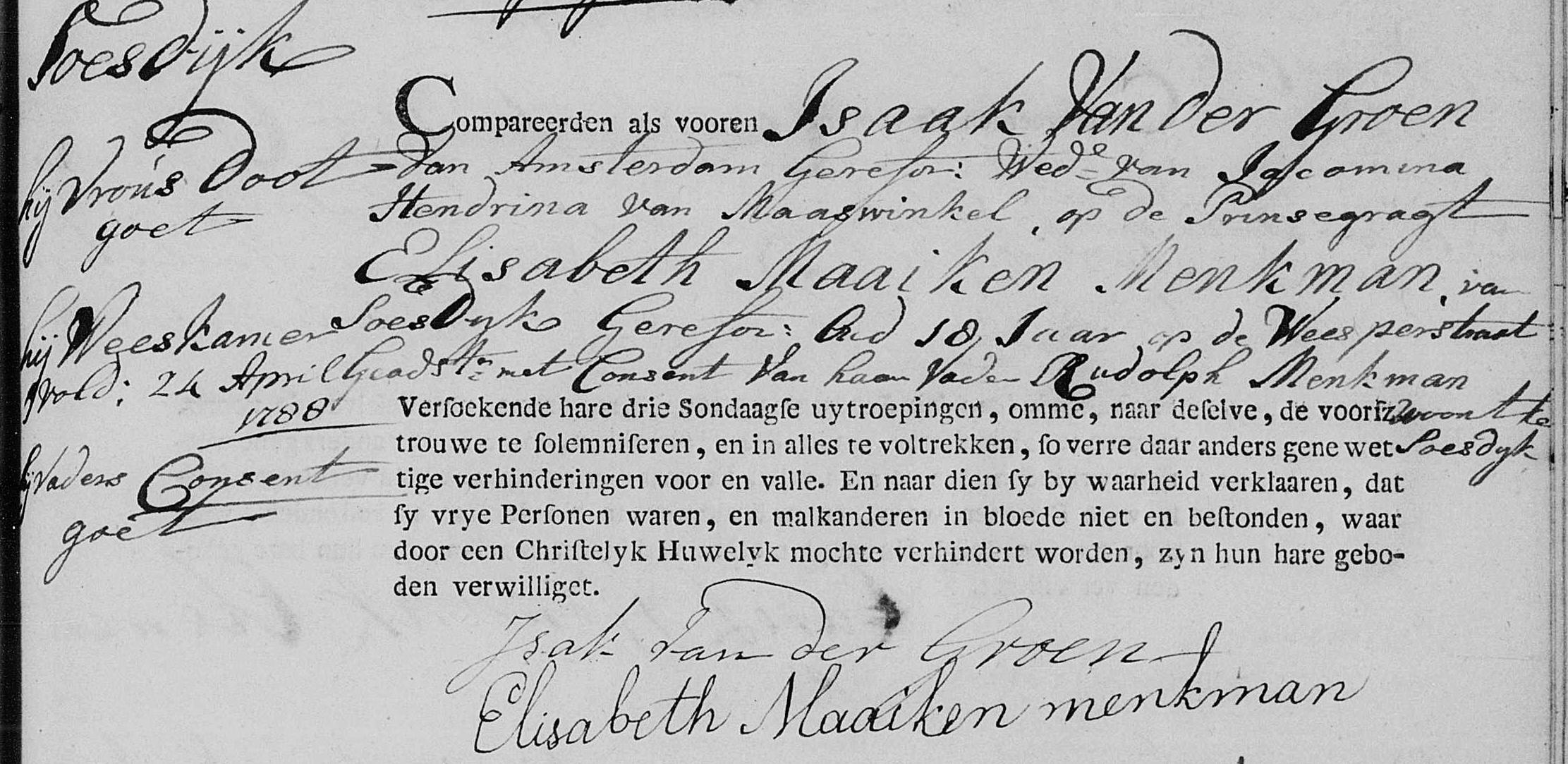 | Trouwt kerkelijk [Akte] (ondertrouw) met als getuige van de bruid het consent van haar vader Rudolph Menkman op 25-04-1788 te Amsterdam, NH, Nederland [Foto1]