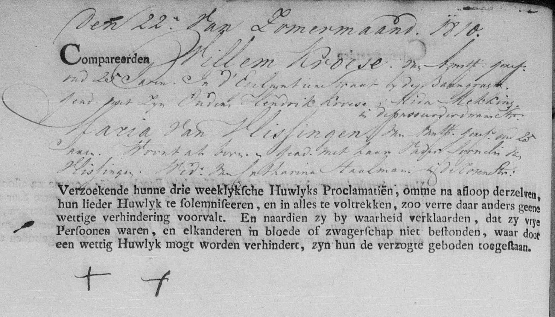 | Trouwt kerkelijk [Akte] (ondertrouw) met als getuigen van de bruidegom zijn ouders Hendrik Kroese en Alida Mekking en als getuige van de bruid haar vader Cornelis van Vlissingen op 22-06-1810 te Amsterdam, NH, Nederland [Foto1]