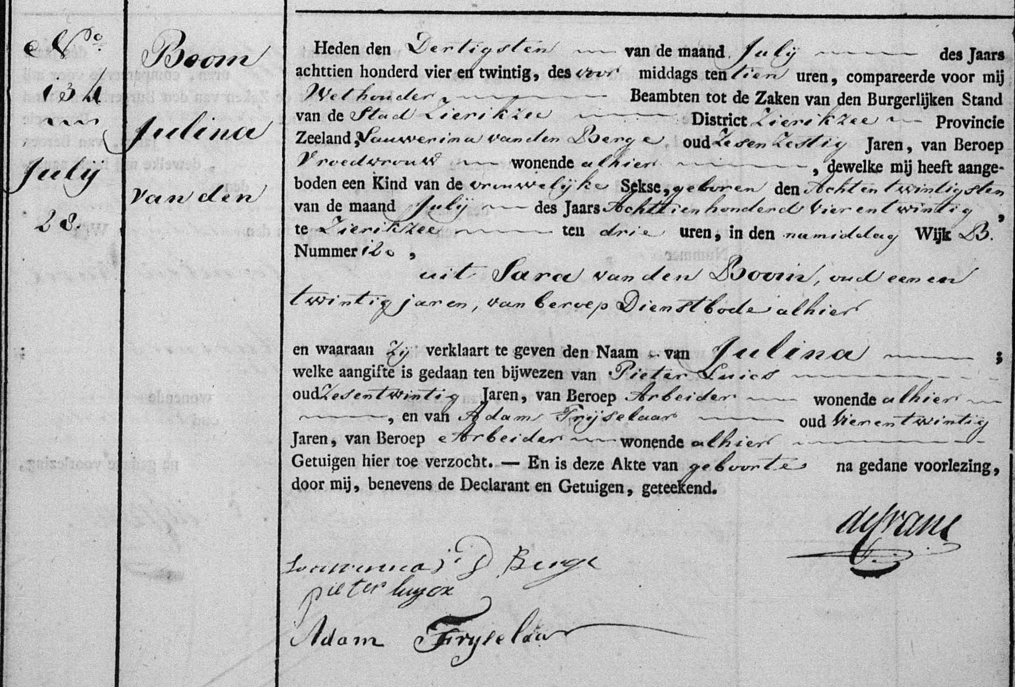 | 15 | 7 | Julina van den Boom geboren [Akte] om 15:00 uur op 28-07-1824 te Zierikzee, ZLD, Nederland, van beroep dienstbode, overleden om 04:00 uur in het huis staande aan de Lange Annastraat no. 19 op 23-12-1884 te Haarlem, NH, Nederland. |