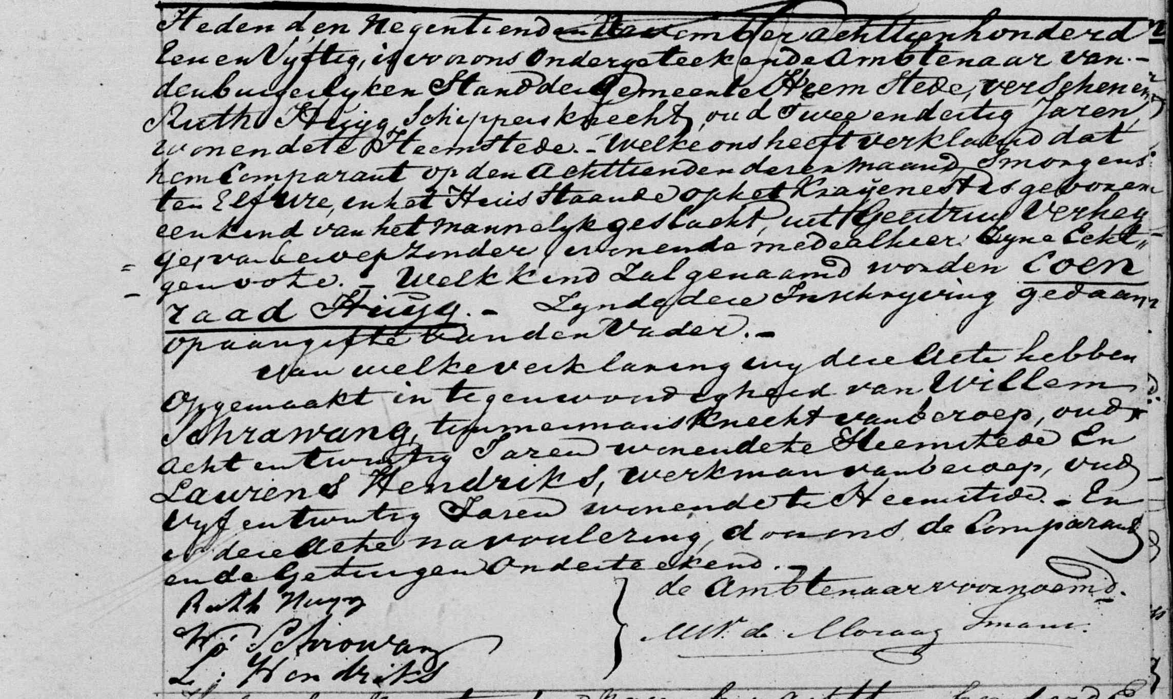 | 12 | 6 | Ruth Huijg geboren [Akte] om 10:30 uur op de Zandvaart op 11-02-1819 te Heemstede, NH, Nederland, van beroep schildersknecht, besteller aan het veer, overleden om 20:30 uur in het huis staande op het Kraaijenest op 09-01-1853 te Heemstede, NH, Nederland. |