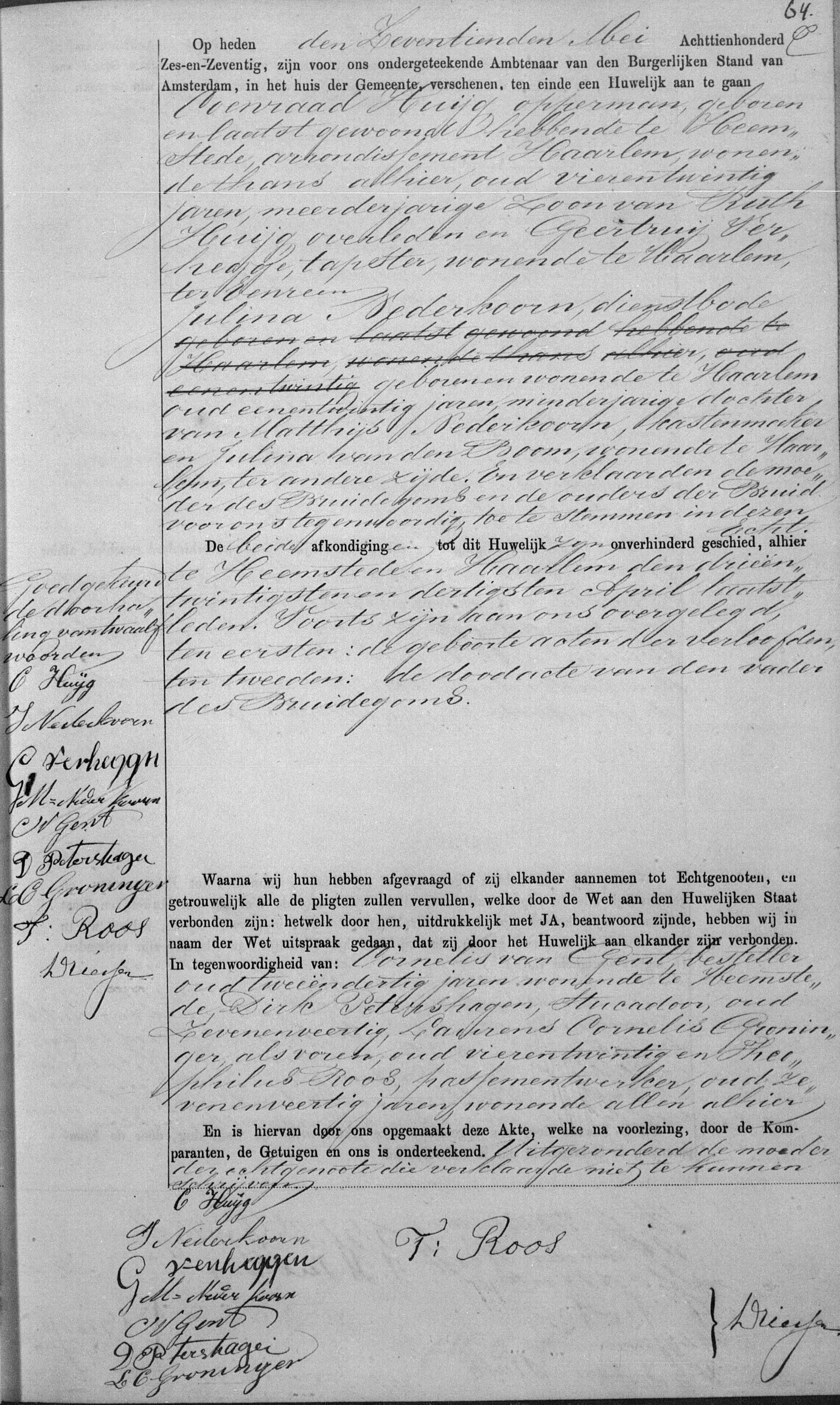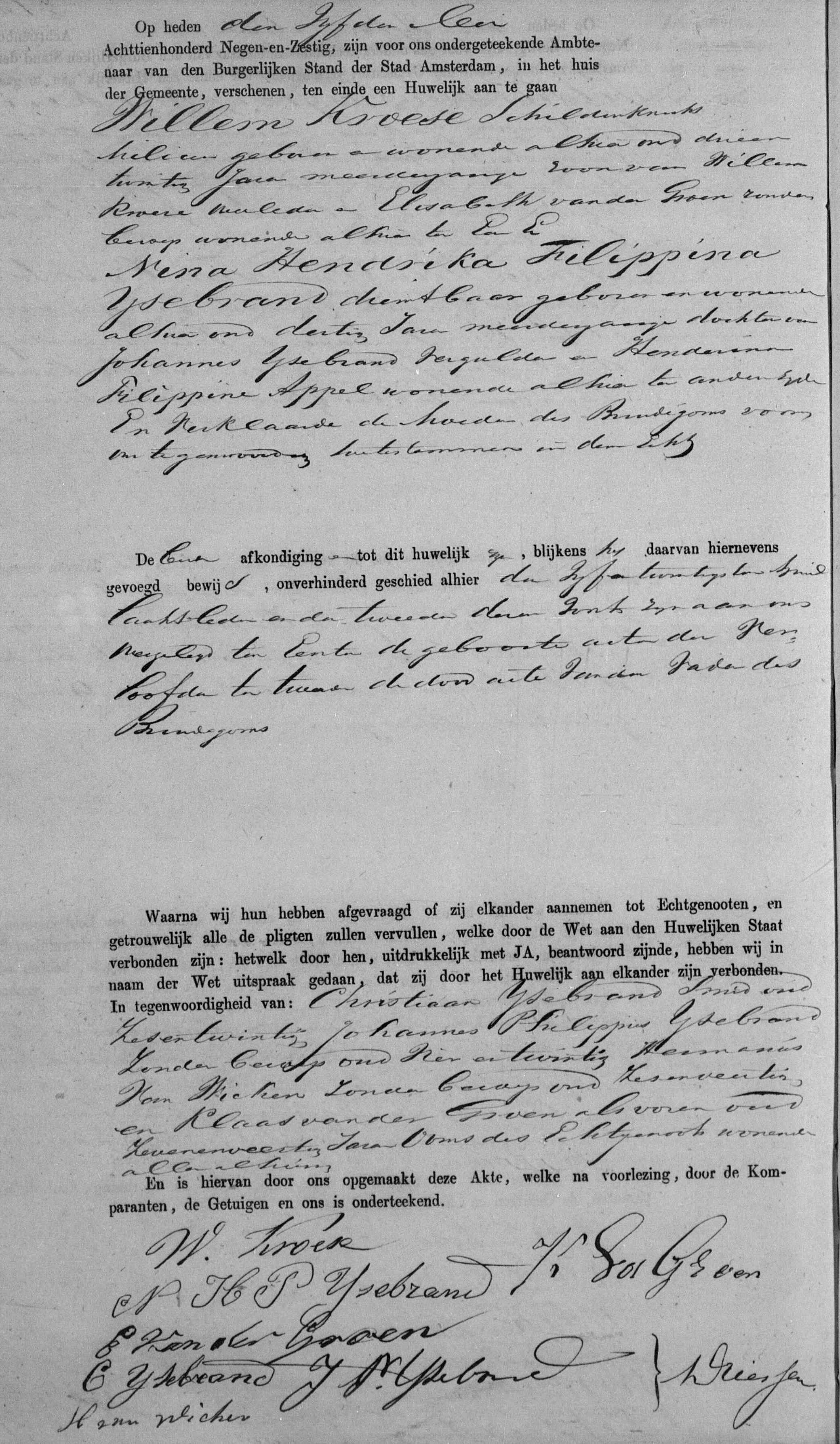 | Trouwt [Akte] met als getuigen Christiaan IJsebrand en Johannes Philippus IJsebrand beide broeders der echtgenoote en Hermanus van Wicken en Klaas van der Groen beide ooms des echtgenoots op 05-05-1869 te Amsterdam, NH, Nederland met: |