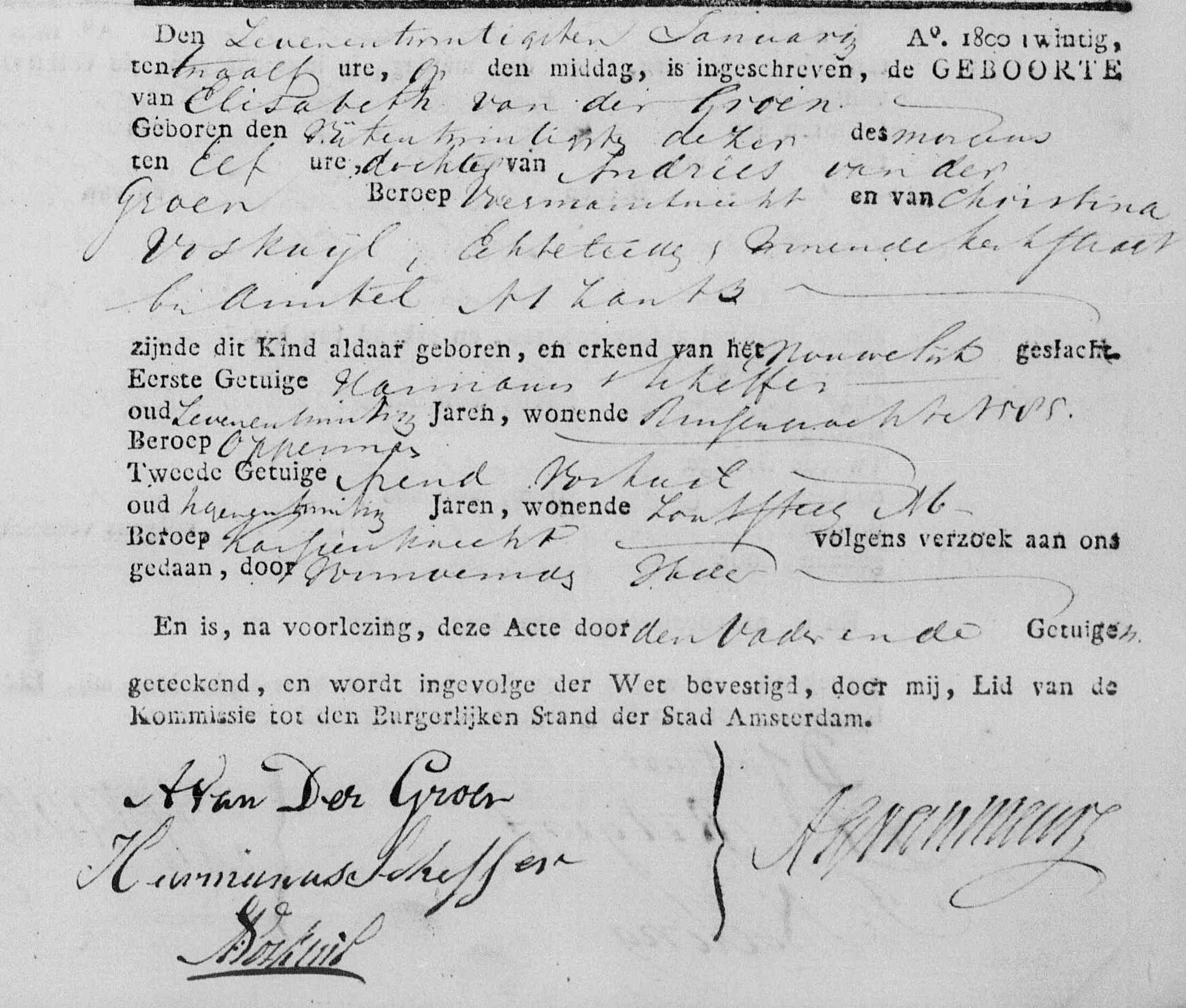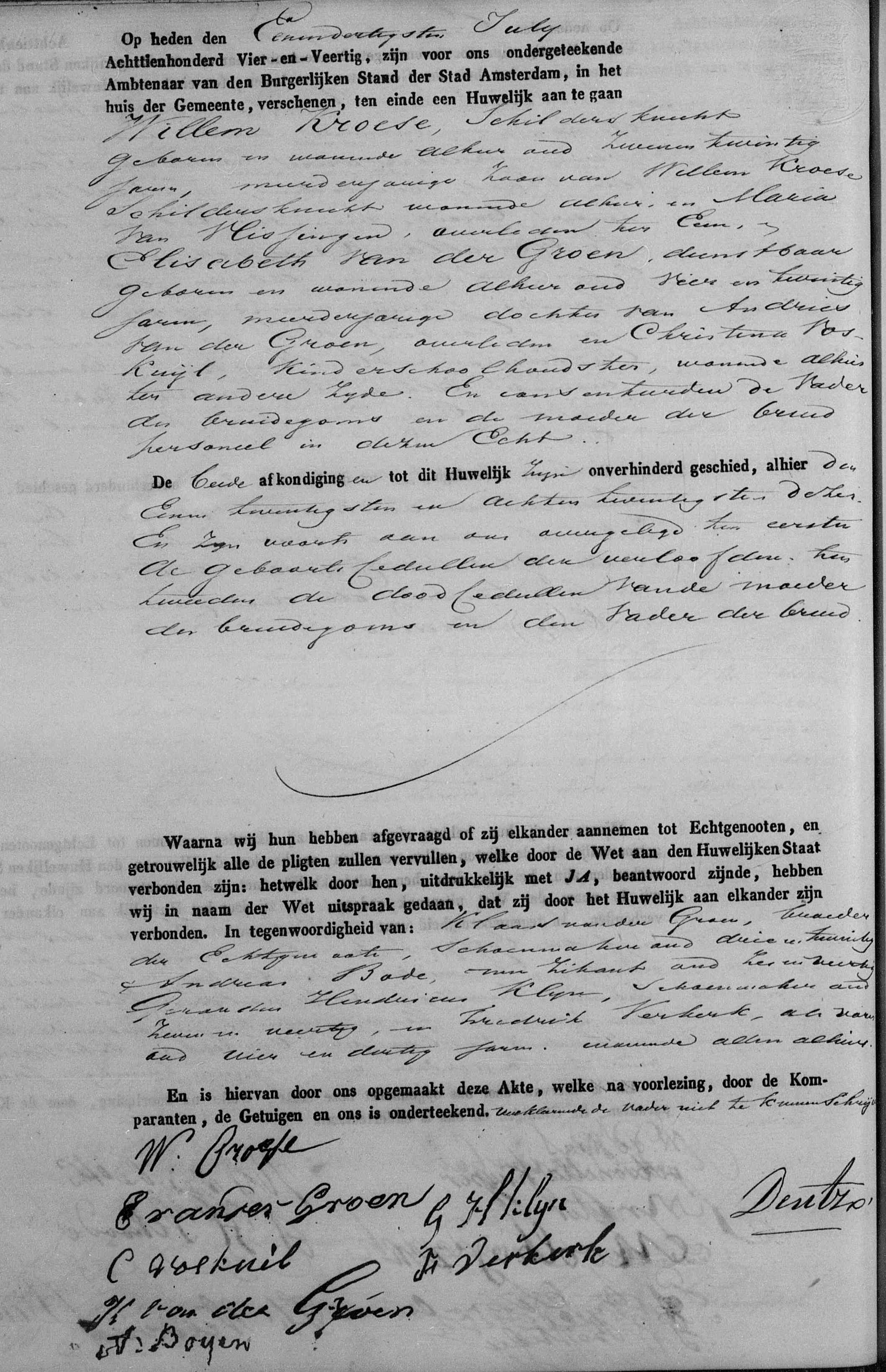 | Trouwt [Akte] met als getuigen Klaas van der Groen broeder der echtgenoote, Andries Bode, Gerard Hendricus Klijn en Fredrik Verkerk op 31-07-1844 te Amsterdam, NH, Nederland [Foto1]