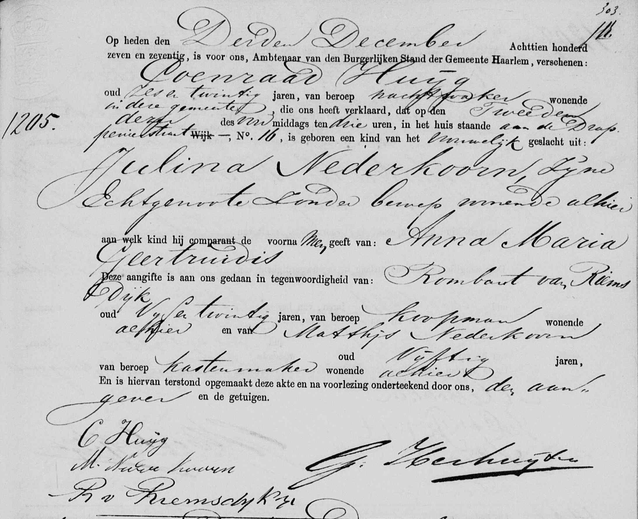 | 6 | 3 | Coenraad Huijg geboren [Akte] om 11:00 uur in het huis staande op het Kraijenest op 18-11-1851 te Heemstede, NH, Nederland, van beroep nachtwaker, spoorwegbeambte, overleden 11-03-1906 te Haarlem, NH, Nederland. |