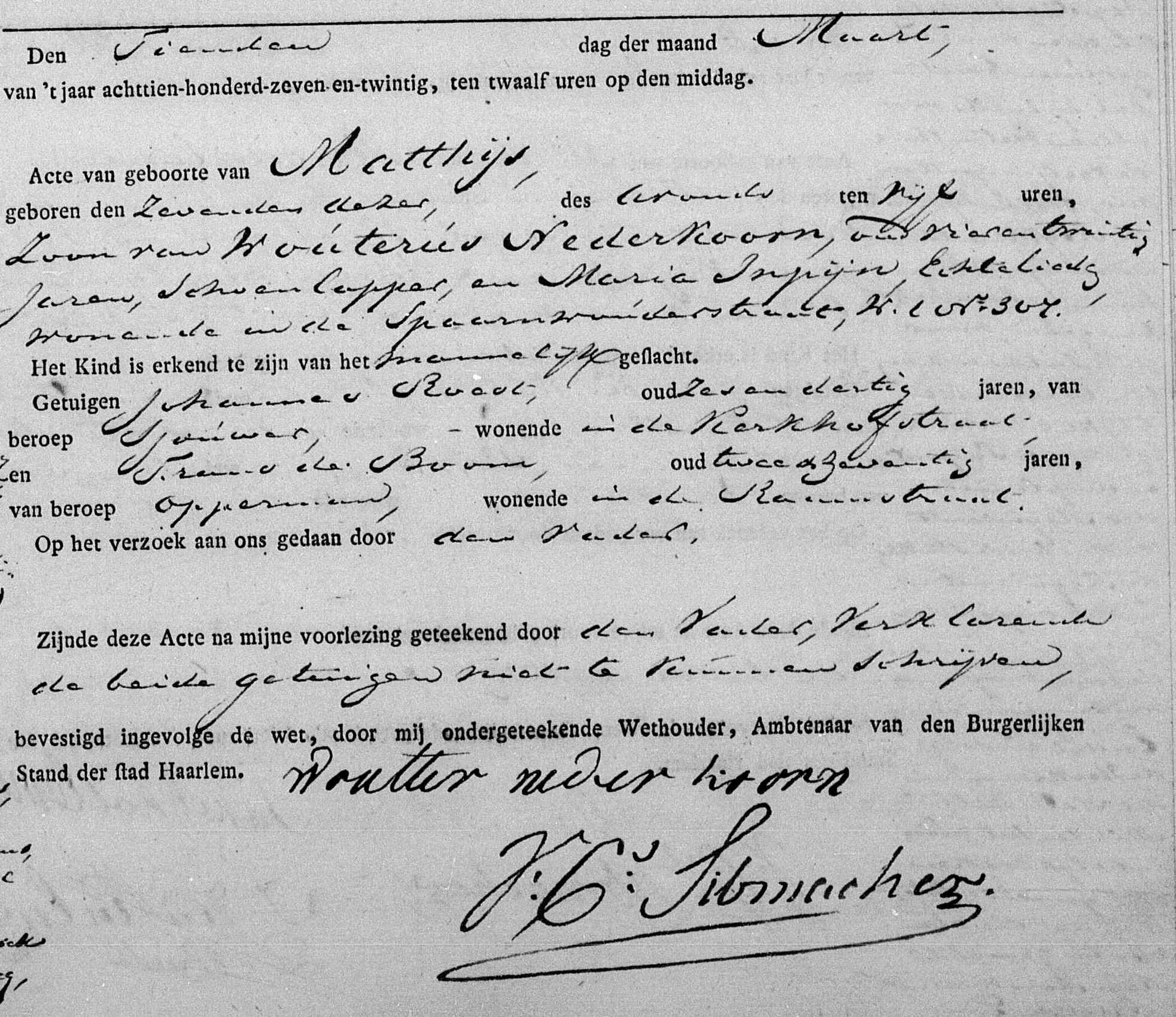 | 14 | 7 | Matthijs Nederkoorn geboren [Akte] om 17:00 uur op 07-03-1827 te Haarlem, NH, Nederland, van beroep meubelmaker, kastenmaker, overleden om 12:00 uur in het huis staande aan de Maerten van Heemskerckstraat no. 2, wonende in de Drappenierstraat no. 16, op 03-02-1903 te Haarlem, NH, Nederland. |