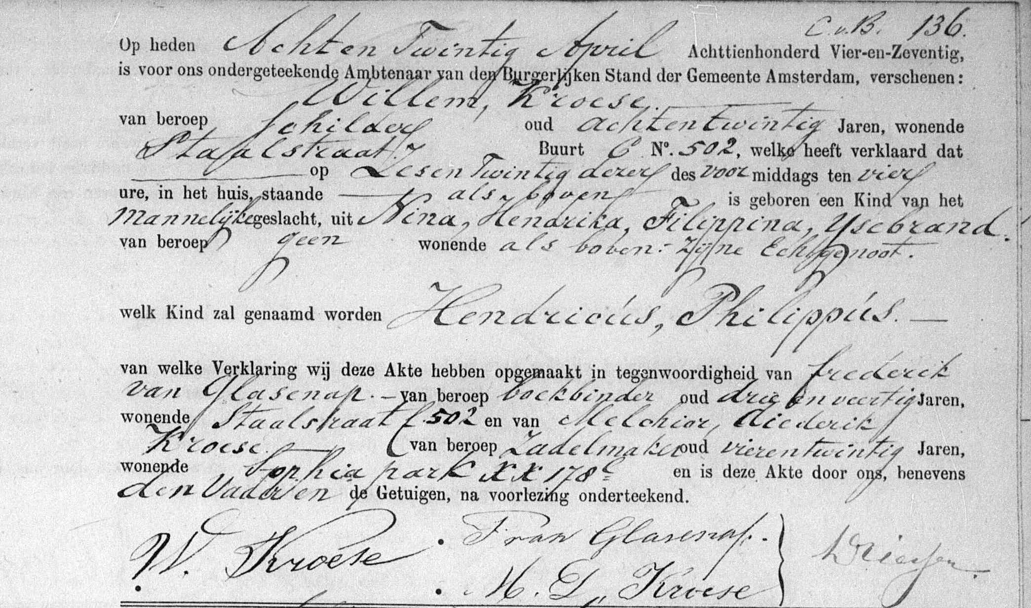 | 4 | 2 | Willem Kroese geboren [Akte] in het huis Utrechtse dwars straat no. 3 om 20:00 uur op 24-05-1845 te Amsterdam, NH, Nederland, van beroep schilder, overleden in het huis van Woustraat 90 om 01:00 uur op 18-04-1901 te Amsterdam, NH, Nederland. |
