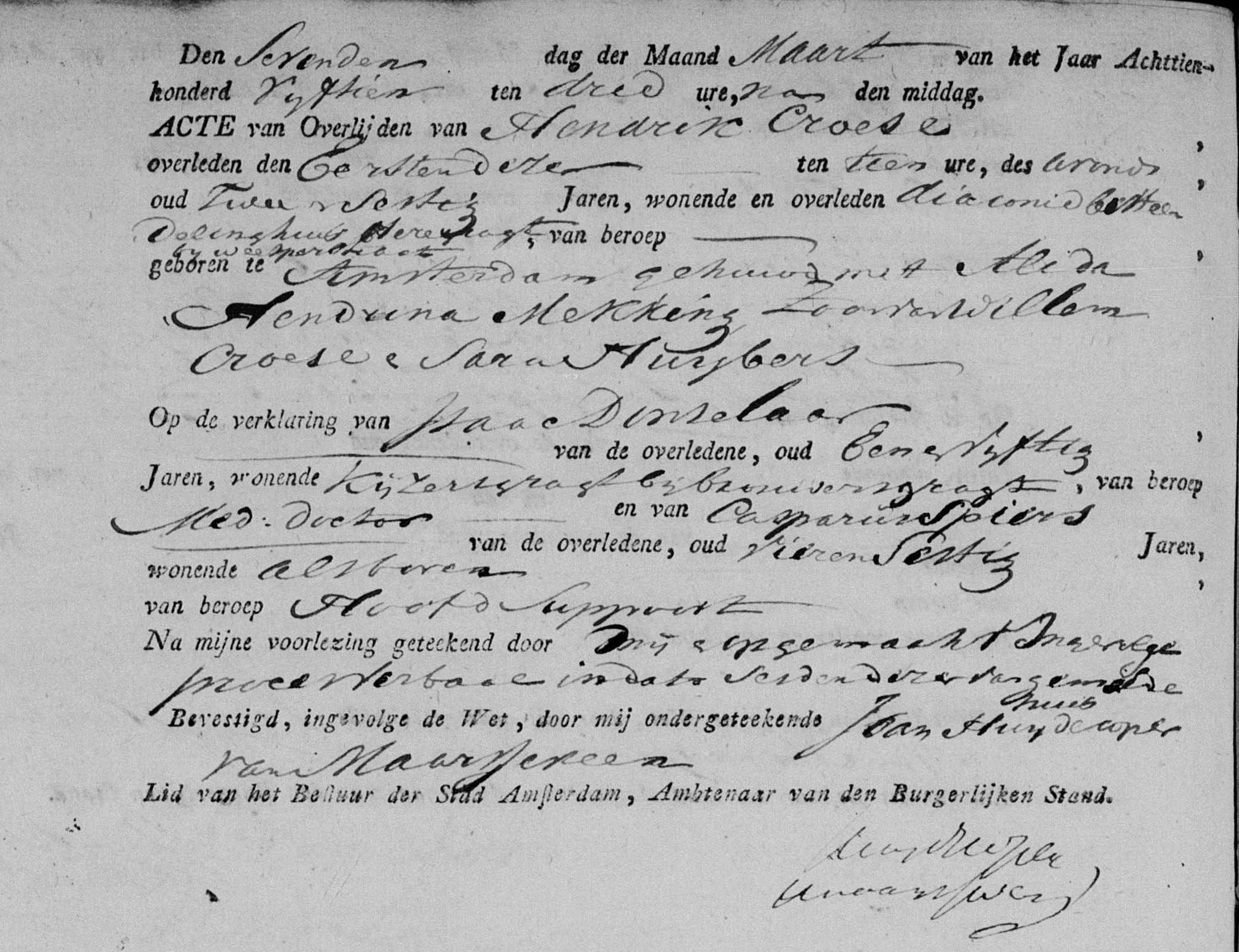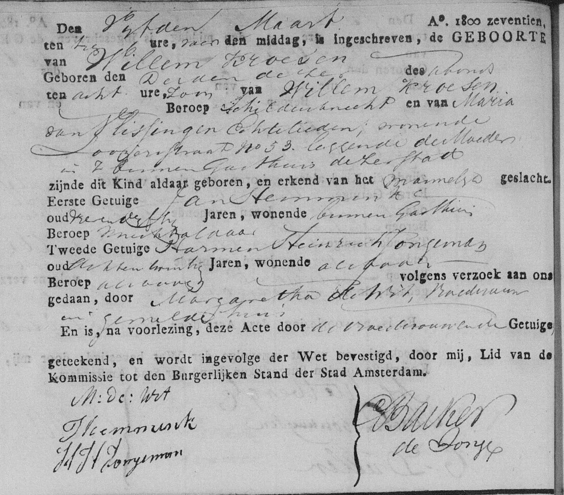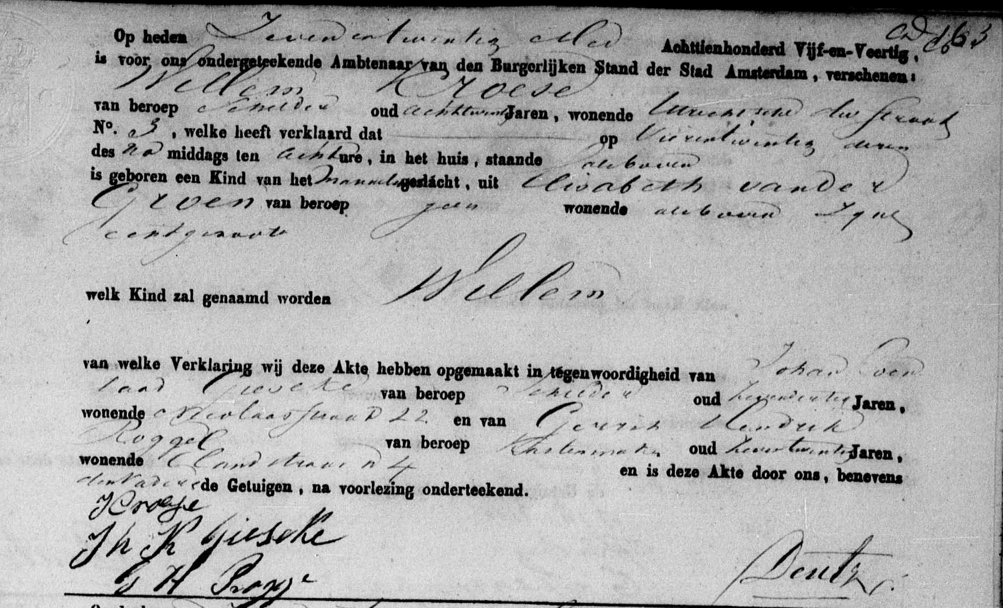 | 16 | 8 | Willem Croese gedoopt hervormd door Wilhelmus Jabes Calkoen met als getuigen Willem Kroeze en Mietje Mekking op 26-06-1785 te Amsterdam (Westerkerk), NH, Nederland, van beroep schildersknegt, tinnegieter, overleden na 2 verpleegdagen in het Binnengasthuis (wonende Baangracht no. 168) om 04:00 uur op 14-06-1861 te Amsterdam, NH, Nederland. |