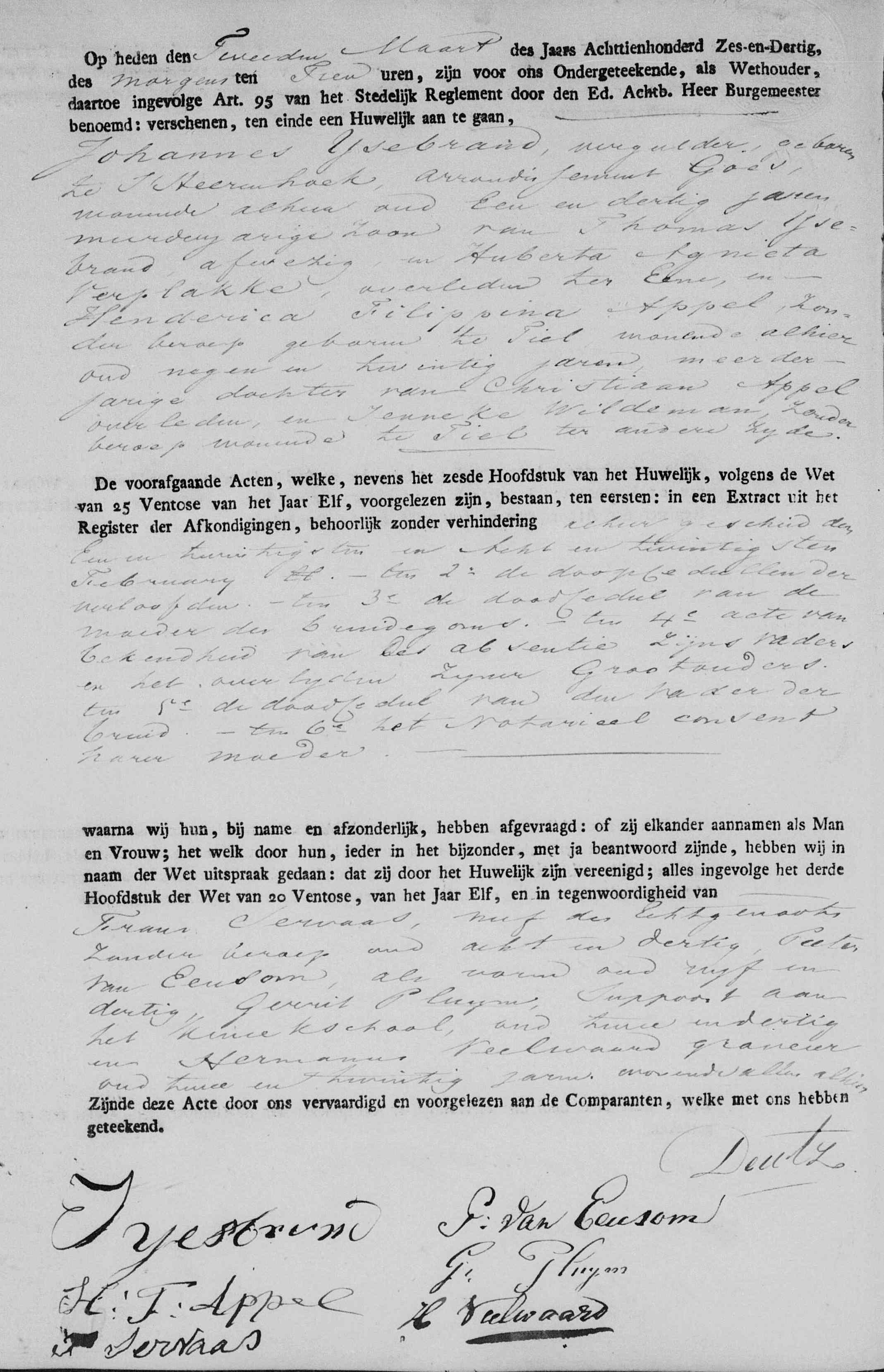 | Trouwt [Akte] s-morgens ten 10 uren met als getuigen Frans Servaas neef des echtgenoots, Pieter van Eeusom, Gerrit Pluijm en Hermanus Veelwaard op 02-03-1836 te Amsterdam, NH, Nederland [Foto1]