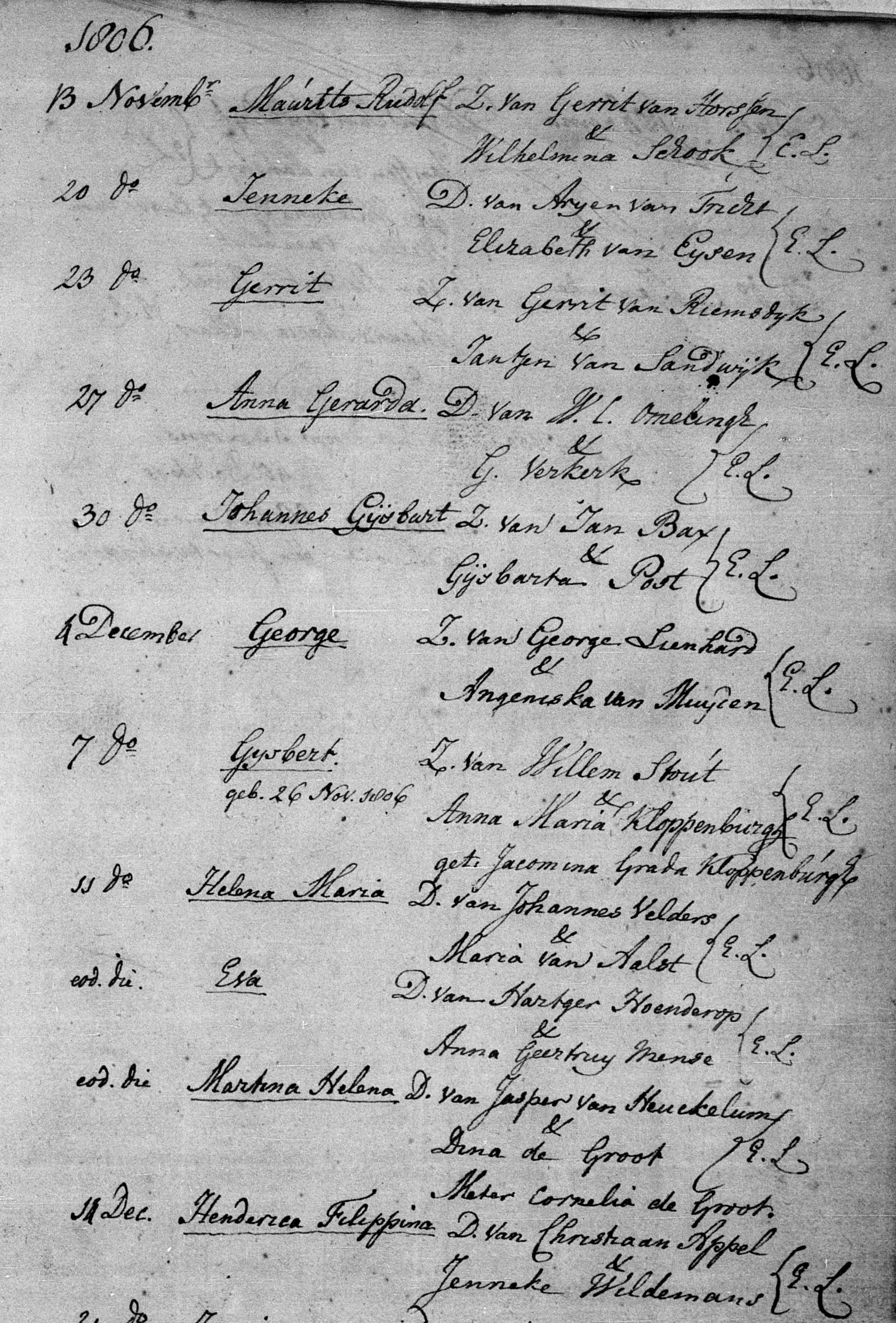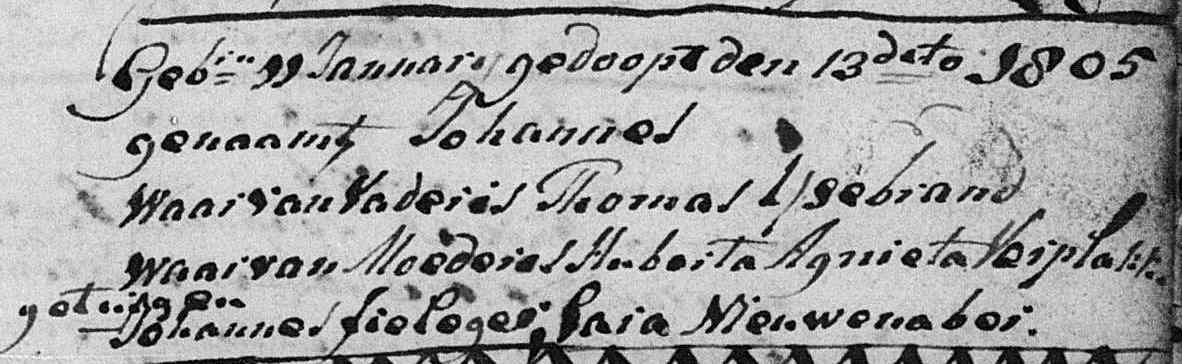 | 20 | 10 | Thomas IJsebrand (IJzebrand, IJsbrand) (hij wordt op 07-12-1807 dood verklaard na aangifte als vermist; op 13-02-1825 trouwt hij als weduwnaar van Huberta Agnieta Verplakke te Leeuwarden met Hiltje Aetes Bloemsma) geboren 16-04-1778 te Doesburg, GLD, Nederland, gedoopt 18-04-1778 te Doesburg, GLD, Nederland, van beroep schoenmaker (cordonnier), kustwachter, overleden voor het overlijden van Hiltje Bloemsma op 17-09-1841. |