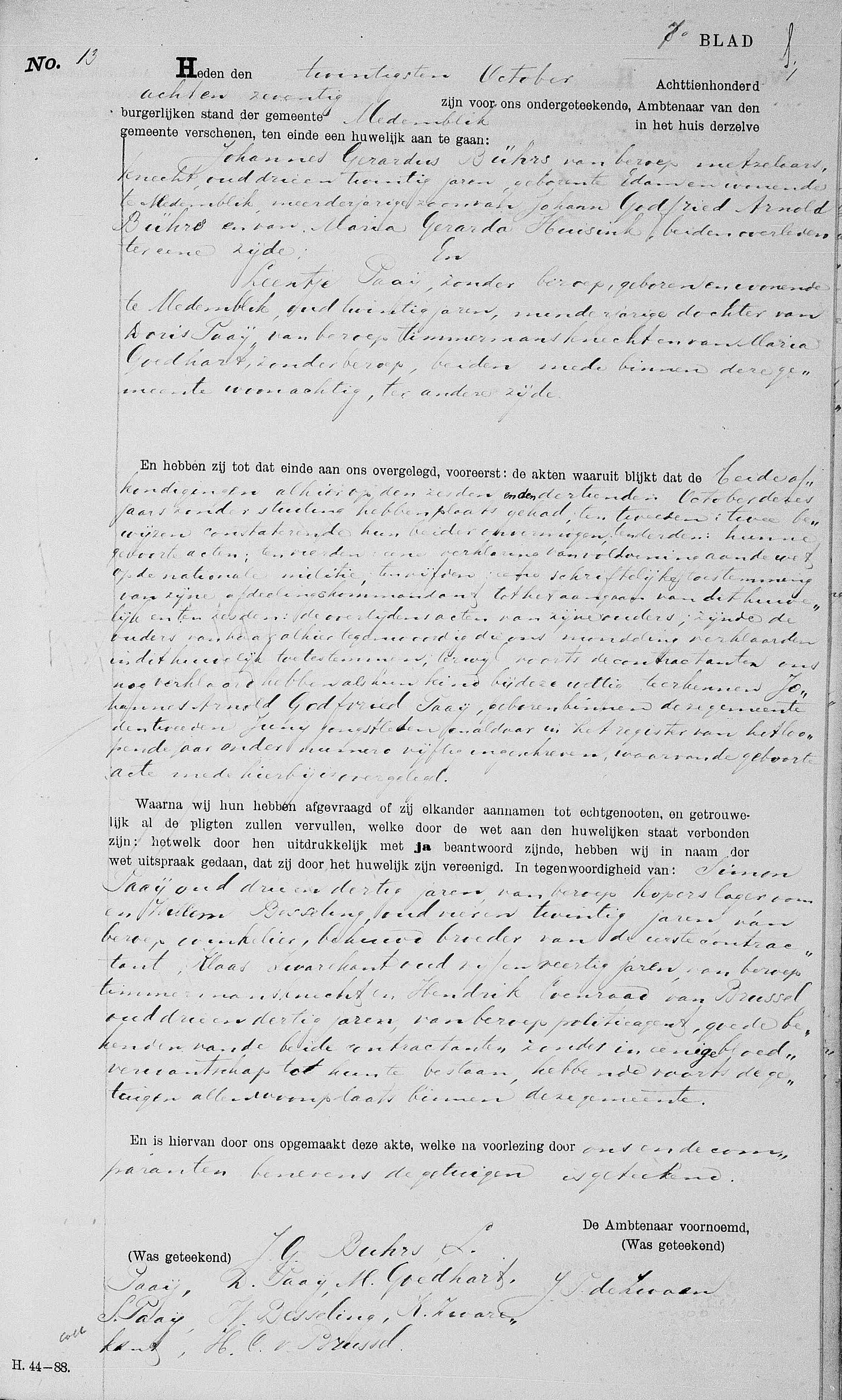 | Trouwt [Akte] met erkenning van Johannes Arnold Godfried Paaij geboren 2 juni 1878 als hun wettig kind op 20-10-1878 te Medemblik, NH, Nederland met: |